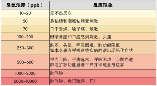 臭氧來無影去無蹤,人體吸入不同濃度的臭氧下,所產生的癥狀也不盡相同: