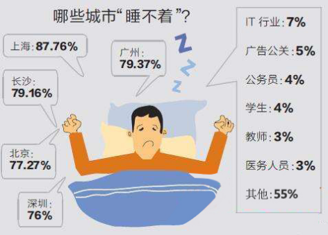 近期,一份反映中國人失眠狀況的《2017年中國網(wǎng)民失眠地圖》走紅。調(diào)查顯示,來自全國362個城市的8567份有效問卷中,近八成參與者曾有過失眠經(jīng)歷或正在失眠,而一線城市更是成為