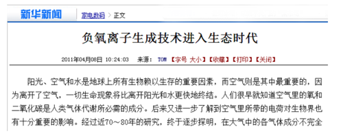 記者根據專家的介紹查閱了相關報道,報道提及:“生態負離子技術可以使設備產生小粒徑空氣負離子即輕離子,小粒徑負離子具有動能高、活性高的特點,有很大的遷移距離和速度,在沒有風機外吹的情況下可以覆蓋到4-5米,形成負離子森林浴環境。”