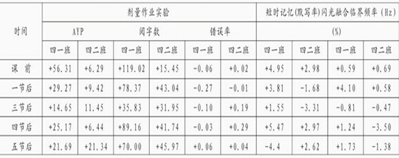 閃光融合臨界頻率兩次測定結果的差值除課前、第三節課后兩次四一班與四二班之間無顯著性差異外(P<0.05),余所有數表明四一班吹離子后臨界頻率增加,作業能力上升。四二班則大多臨界頻率減小,作業能力下降,或者上升不明顯。