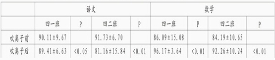四年級兩個班雙盲對照安裝空氣負離子裝置前后兩個學年末考試成績比較如表所示。
