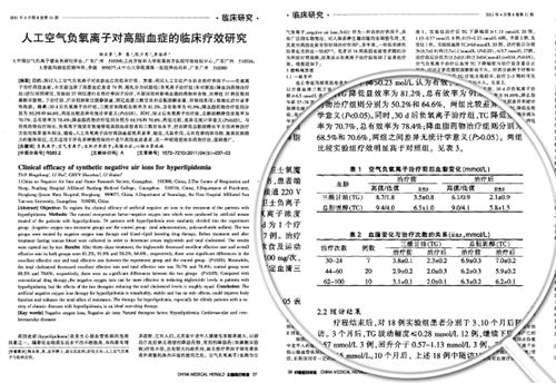 在《人工空氣負氧離子對高脂血癥的臨床療效研究》中,香港瑪麗醫院選取部分高血脂患者,應用森肽基負離子機(可生成高濃度、生態級的小粒徑負離子)輔助治療,臨床有效率達到91.9%,臨床研究結果表明:人工負氧離子治療高脂血癥效果顯著、穩定、無副作用,且有改善機體功能、提高抗病能力的整體效應。