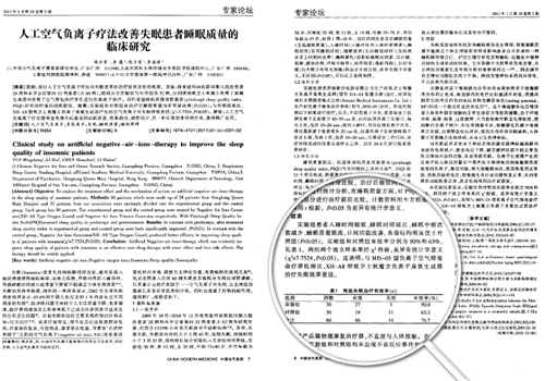 而在該文獻資料中表明,中、香港瑪麗醫院對60例失眠患者進行空氣負離子治療,實驗組承受山東新活醫療科技有限公司所生產的負氧離子生成機進行治療,對照組用日本賽路美株式會社生產的負離子維他命療養機治療。