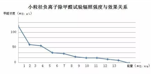 實驗中以小粒徑負離子作為反應(yīng)中的活性中間體,對甲醛的空氣混合物進行輻照,如果將輻射能量加大到13kgy時,甲醛的濃度則幾乎降到了零,反應(yīng)產(chǎn)物也幾乎都轉(zhuǎn)化成了水和二氧化碳。