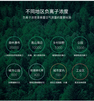國(guó)際聯(lián)盟大氣聯(lián)合委員會(huì)告訴我們,人每天需要約130億個(gè)生態(tài)負(fù)離子,而我們的居室,辦公室,娛樂(lè)場(chǎng)所等環(huán)境,所提供的負(fù)離子濃度無(wú)法滿足這一需求。除了長(zhǎng)時(shí)間待在森林等區(qū)域,也可通過(guò)人工方式予以生成,廣泛應(yīng)用于室內(nèi)環(huán)境凈化以及家庭療養(yǎng)保健之中。
