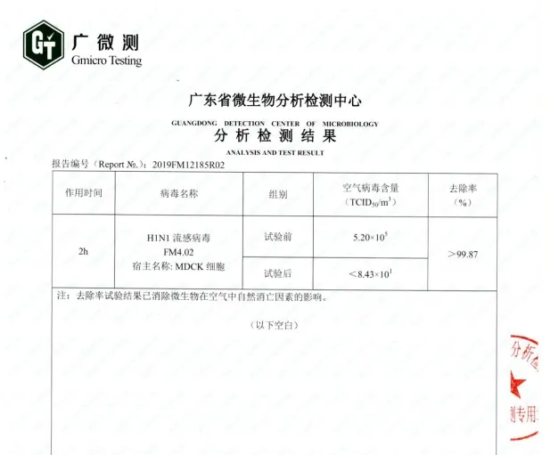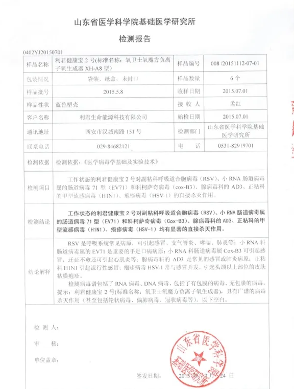 通過以上檢測報告我們可以清晰直觀的看到:負離子機可以有效殺滅H1N1、H3N2等流感病毒,EV71手足口病毒、COX-B3薩科齊病毒、AD3、HSV-1皰疹病毒等,同時對于RNA病毒、DHA病毒,包括有包膜的病毒、無包膜的病毒,以及輪狀病毒、冠狀病毒均有殺滅作用。