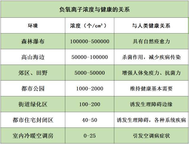 據環境學家研究發現,空氣中負氧離子濃度每立方厘米低于20個以下時,人會感到倦怠、頭昏腦脹;當每立方厘米空氣中的負氧離子數在1000~2000個之間時,是人體必需的最低含量,當每立方厘米空氣中的負氧離子數在2000~5000個之間時,人就會感到心平氣和、平靜安定;當每立方厘米空氣中的負氧離子數在5000~50000個時,人就會感到神清氣爽、舒適愜意,而且可增加對疾病與細菌等的抵抗力;而當每立方厘米空氣中的負氧離子數高達10萬個以上時,就能起到鎮靜、止喘、消除疲勞、調節神經等防病治病效果。
