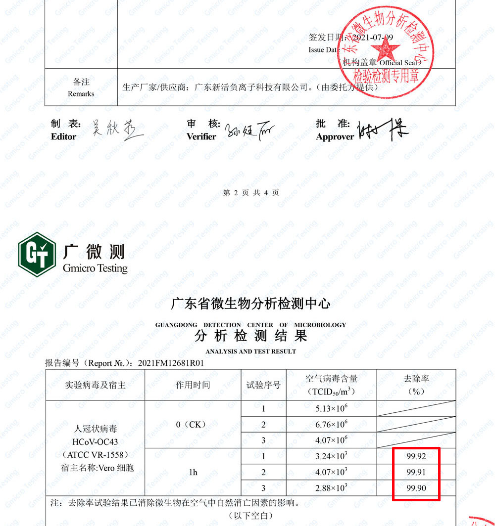 廣微測最新檢測證明負(fù)離子殺滅冠狀病毒有效率高達(dá)99.9%以上 |