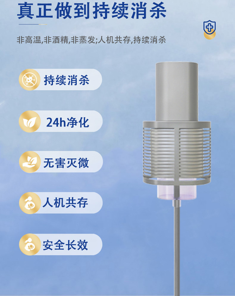 目前,市面上多數(shù)的空氣凈化設(shè)備只能對空氣污染物進(jìn)行簡單過濾。然而,過濾并不等同于消毒,此類空氣凈化設(shè)備的過濾器只能吸附顆粒物,無法吸附病毒等微小的有害物質(zhì),而附著在顆粒物上的細(xì)菌、真菌等可能會在過濾網(wǎng)上滋生、繁殖,并二次污染空氣。其他的空氣殺毒技術(shù),如紫外線照射、臭氧、高溫、酒精等,也都存在殺滅耗時長、人必須回避、無法持續(xù)作用、效果欠佳等問題,難以實(shí)現(xiàn)人機(jī)共存的持續(xù)消殺,無法實(shí)現(xiàn)對細(xì)菌、病毒的快速直接消殺效果。